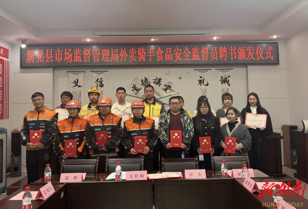 湖南日报·新湖南客户端4月20日讯(通讯员 石威远 熊玉萍 记者 易鑫) 近日,在新晃侗族自治县,来自“淘宝闪购”和“美团”平台的16名外卖骑手,从新晃市场监督管理局工作人员手中接过聘书,成为首批网络餐饮食品安全社会监督员。