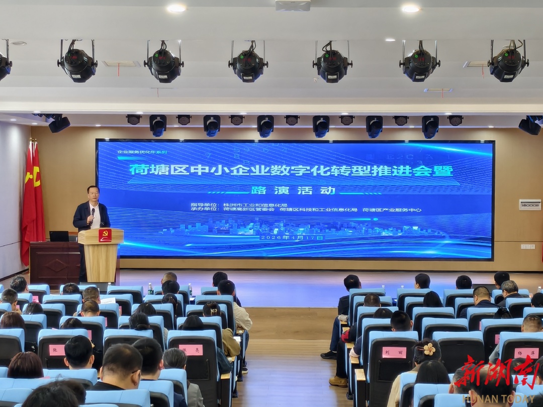 湖南日报·新湖南客户端4月20日讯(通讯员 傅晶芬)近日,株洲市荷塘区中小企业数字化转型工作推进会暨路演活动在钻石空间成功举办。作为全区“企业服务优化年”的重点务实举措,本次活动紧扣中小企业数字化转型现实需求,集政策解读、案例分享、服务商路演、金融赋能于一体,吸引辖区60余家制造业企业参与,以精准服务为中小企业转型升级注入强劲动力。