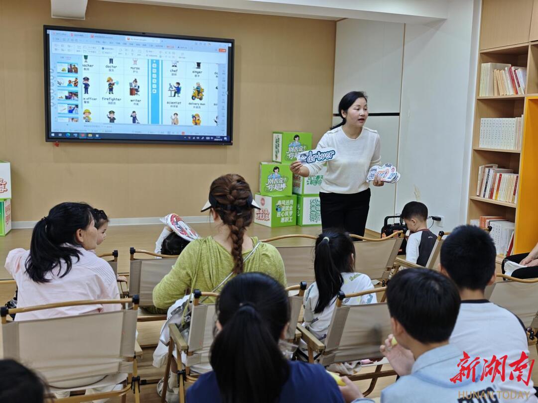 上午十点半,温馨的亲子读书沙龙正式拉开帷幕。阅读老师用一句简单的英语提问:“What do you want to be when you grow up?”“我要当宇航员!Fly to the moon!”8岁的点点大声喊道,还兴奋地比出火箭发射的手势;“我想当医生!Help sick people!”另一位小朋友也不甘示弱地回应,童真童趣的话语引得现场居民阵阵欢笑。在轻松愉悦的氛围里,家长与孩子一同用英语交流梦想、分享阅读心得,沉浸式感受双语阅读的乐趣与亲子共读的温暖。