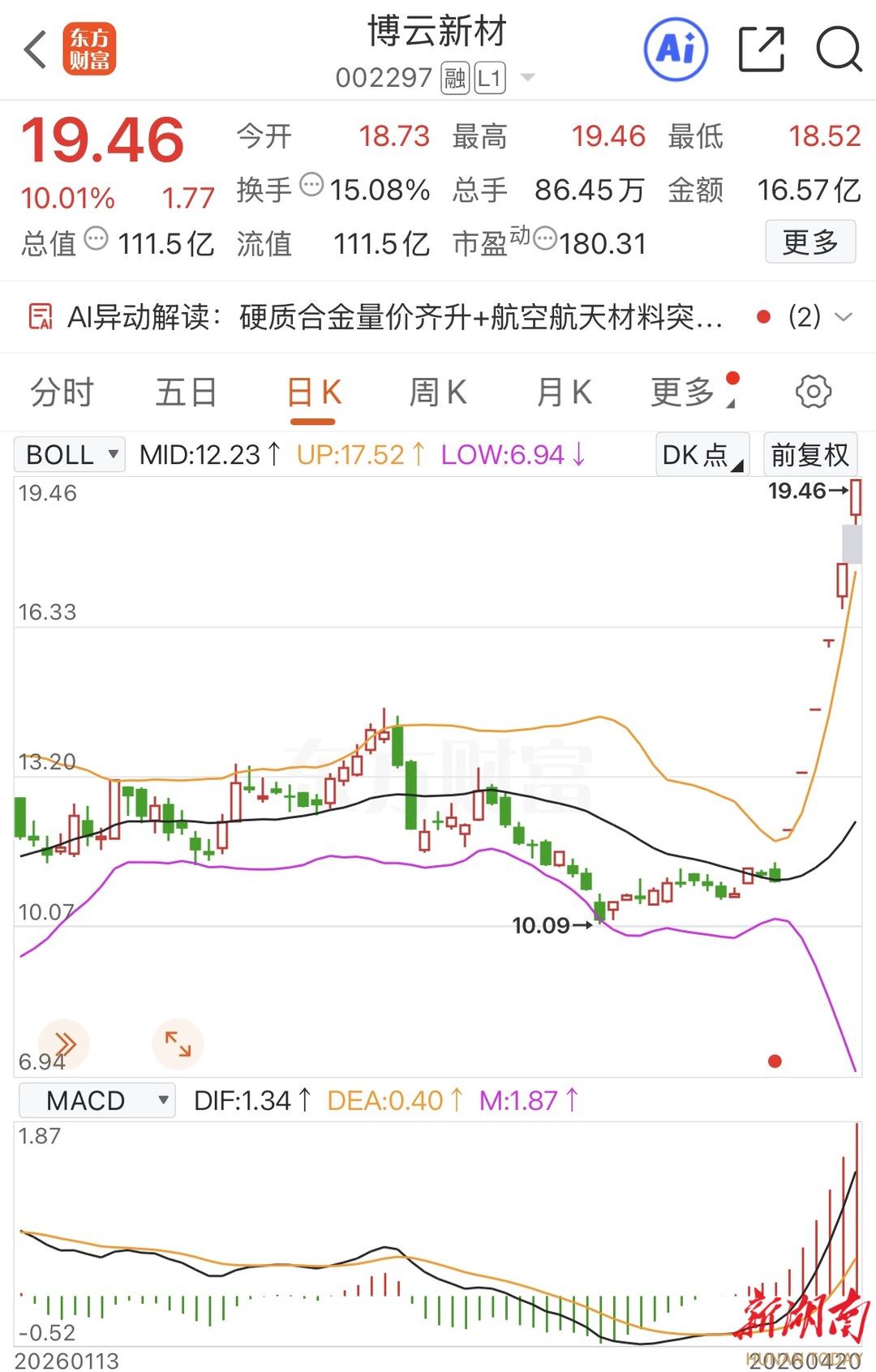 湖南板块今日整体温和上行、局部加速,90余只湘股上涨,个股涨跌幅分化明显,多数个股小幅收涨。其中,博云新材、泰嘉股份、华升股份、株冶集团四只湘股强势涨停,覆盖航空航天、高端制造、纺织制造、有色金属四大赛道。值得关注的是,博云新材6天6板,近5个交易日涨幅超60%。其业绩报告显示,公司2025年实现营业收入9.10亿元,同比增长27.77%;归母净利润6185.36万元,同比增长192.00%;扣非净利润3876.58万元,同比增长140.91%。