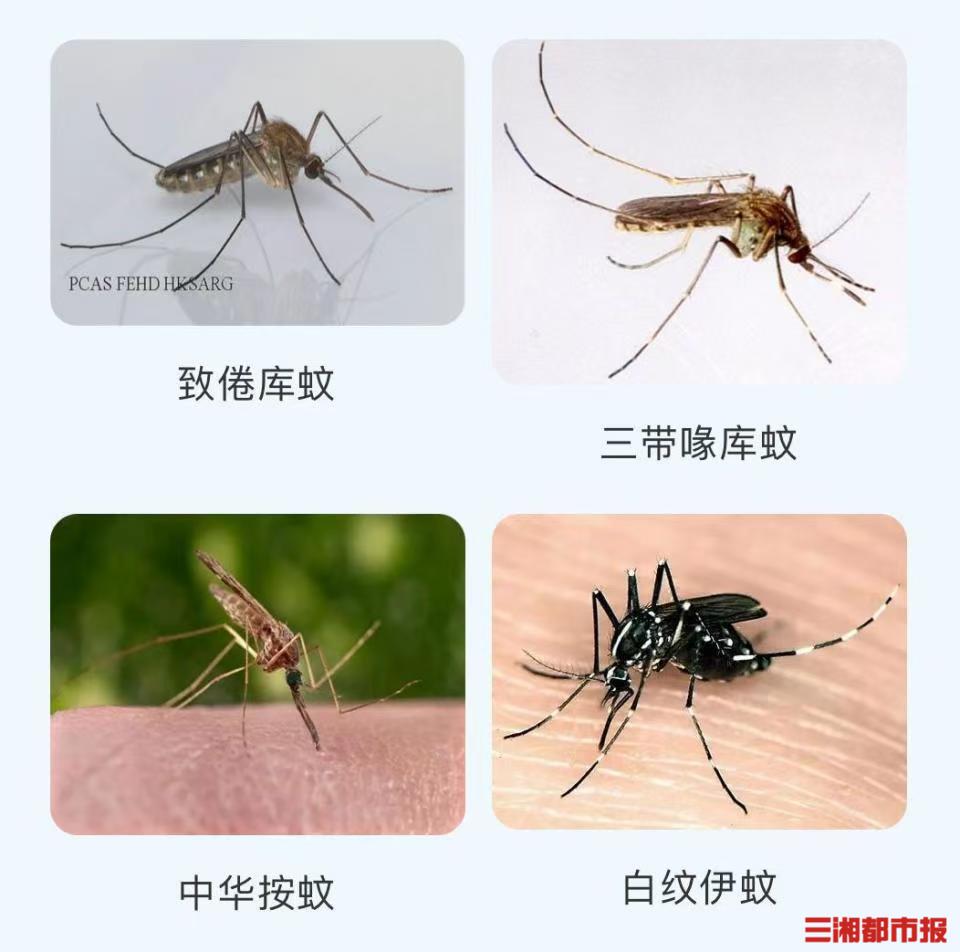 记者从湖南省疾控中心了解到,我省常见的蚊子主要包括白纹伊蚊(花斑蚊)、库蚊(家蚊)、按蚊(疟蚊)以及三带喙库蚊、中华按蚊等,其中伊蚊、库蚊和按蚊是重点防范的三大类,可传播登革热、基孔肯雅热、乙型脑炎和疟疾等疾病。