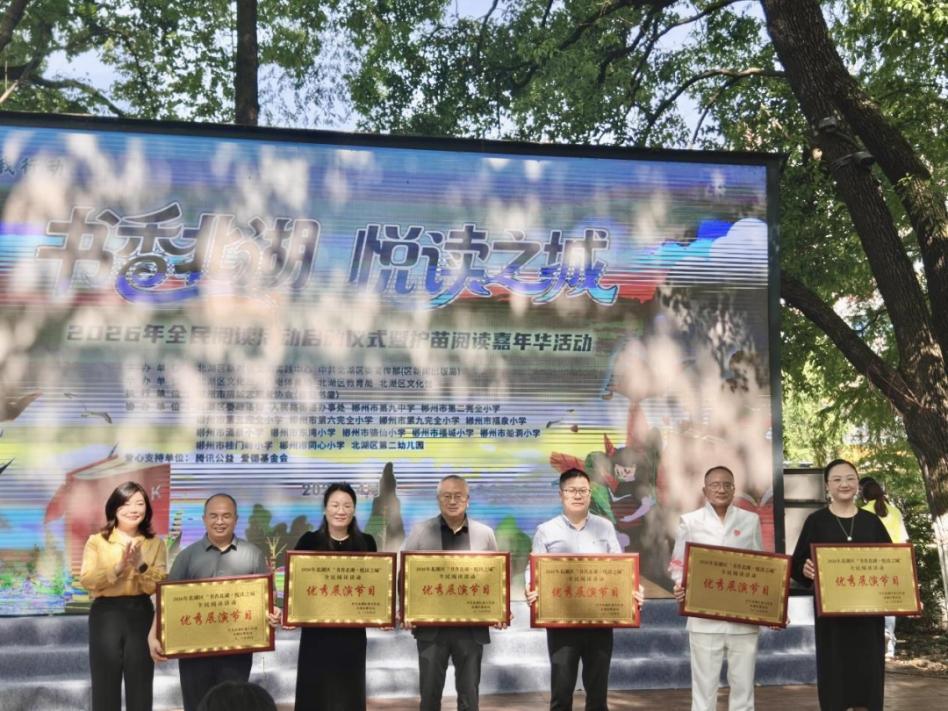 新湖南客户端讯(通讯员:陈丽 廖颖果)4月19日,郴州市北湖区“书香北湖·悦读之城”全民阅读活动在水月洲正式启幕。郴州市涌泉小学陈丽、杨婧、廖颖果等老师原创的音诗画节目《林邑之歌》精彩亮相,用朗朗童声吟诵家乡文脉,用真挚情感礼赞大美郴州,凭借独特创意与出色表现,斩获现场“优秀展演节目”荣誉。