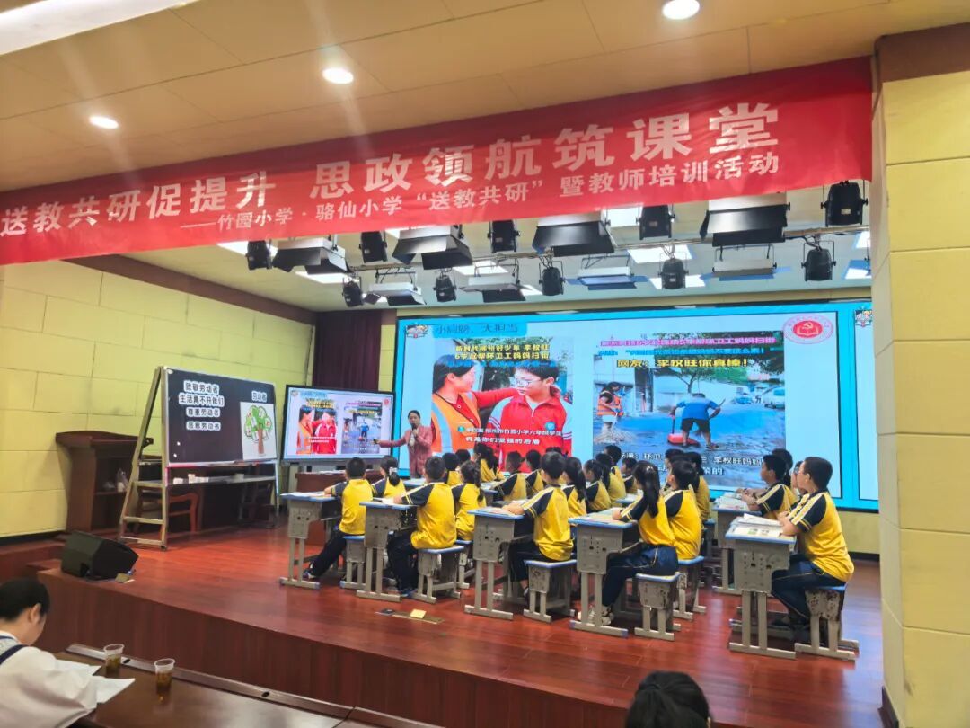 活动伊始,骆仙小学李志平书记致欢迎词,他对本次校际送教共研活动的举办表示祝贺,对前来送教交流的竹园小学团队与两区教研专家表示衷心感谢,期待两校以此次活动为契机,互学互鉴、共促成长。