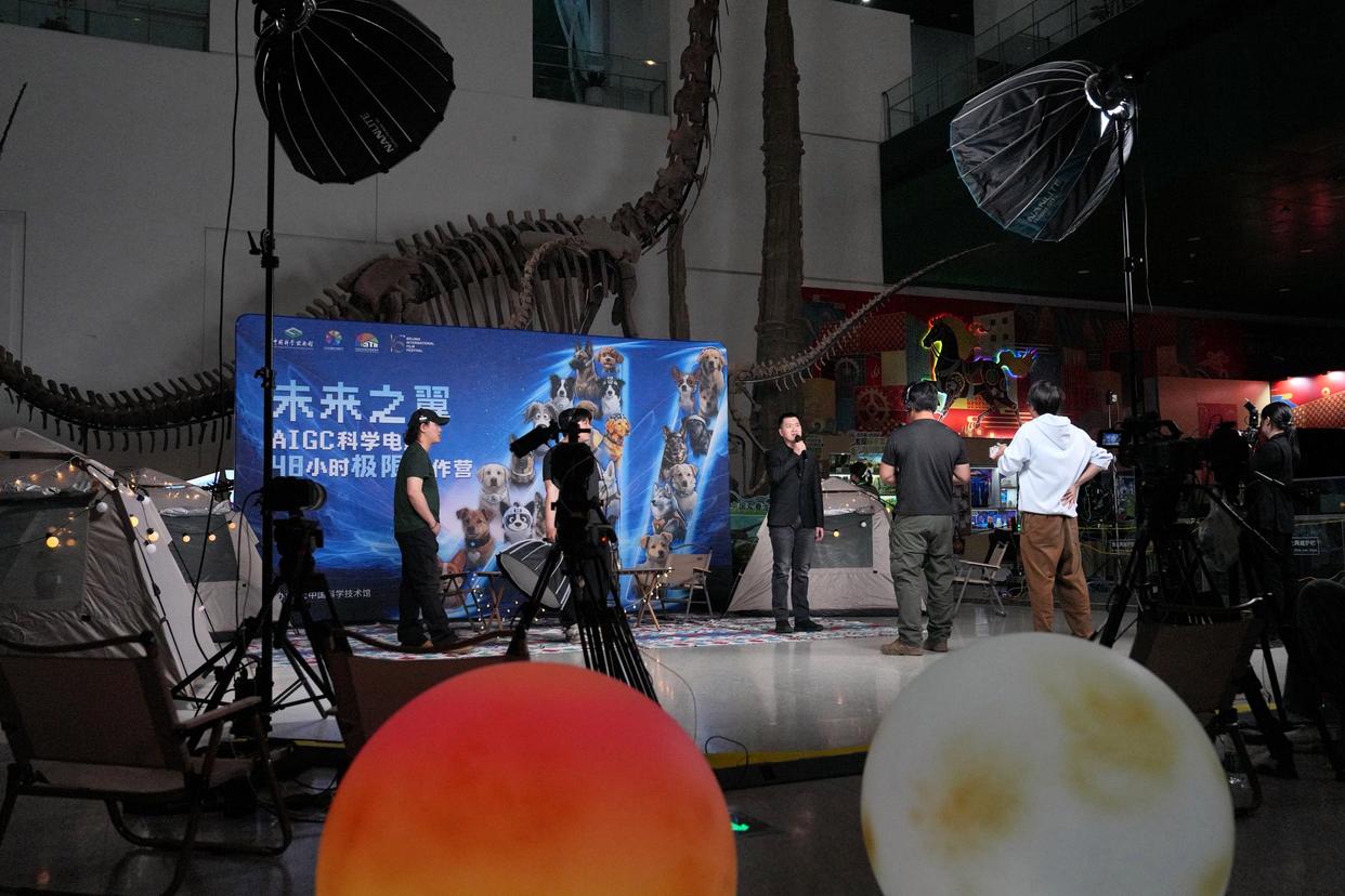 13时40分创作营启动。记者探访时,天光已暗,屏幕倒计时展示“43小时29分28秒”,中国科技馆恐龙广场上支起的帐篷旁,营员们埋头创作,几乎没有人顾得上抬头看时间。