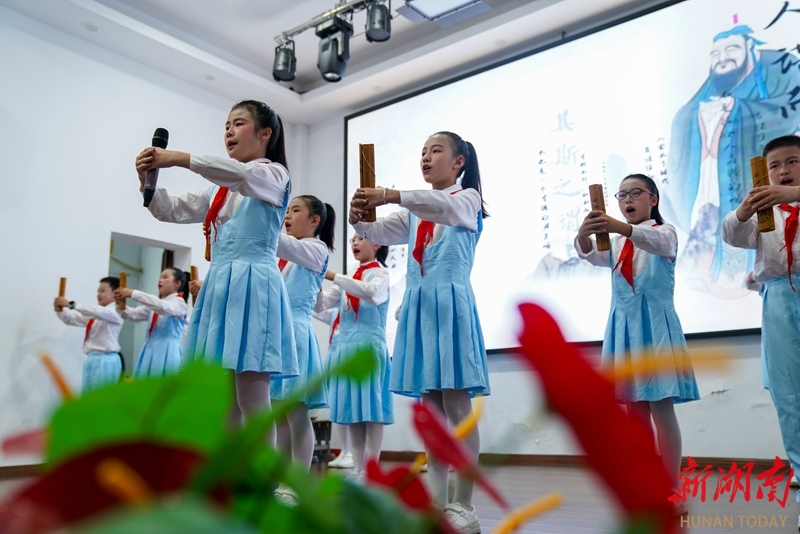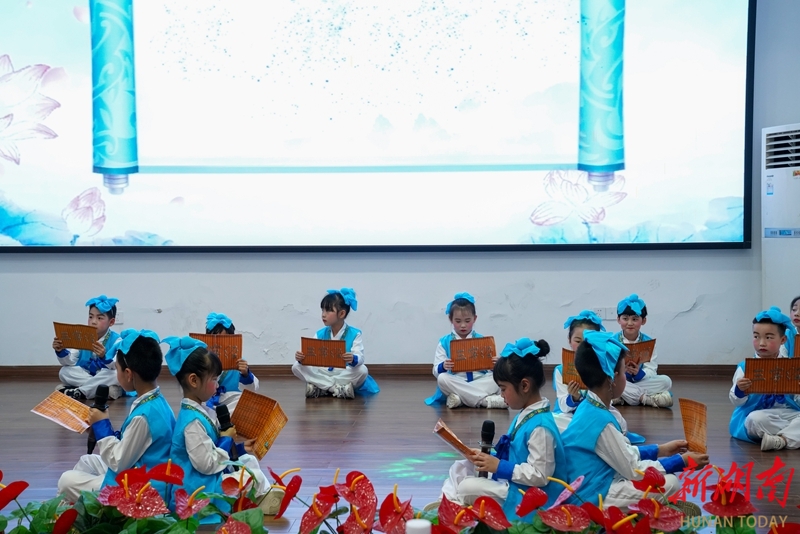 4月20日,资兴市图书馆,市二完小学生在表演《经典礼遇,文明同行》。当天,2026年“书香资兴”全民阅读周暨“4·23”世界读书日系列活动在该馆举行。活动通过阅读推广、成果展演、互动体验等形式,推动阅读资源全域覆盖,让书香成为城市文化名片。袁利华 何洪海 摄影报道(湖南图片库)
