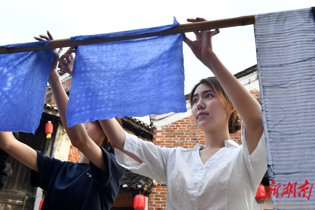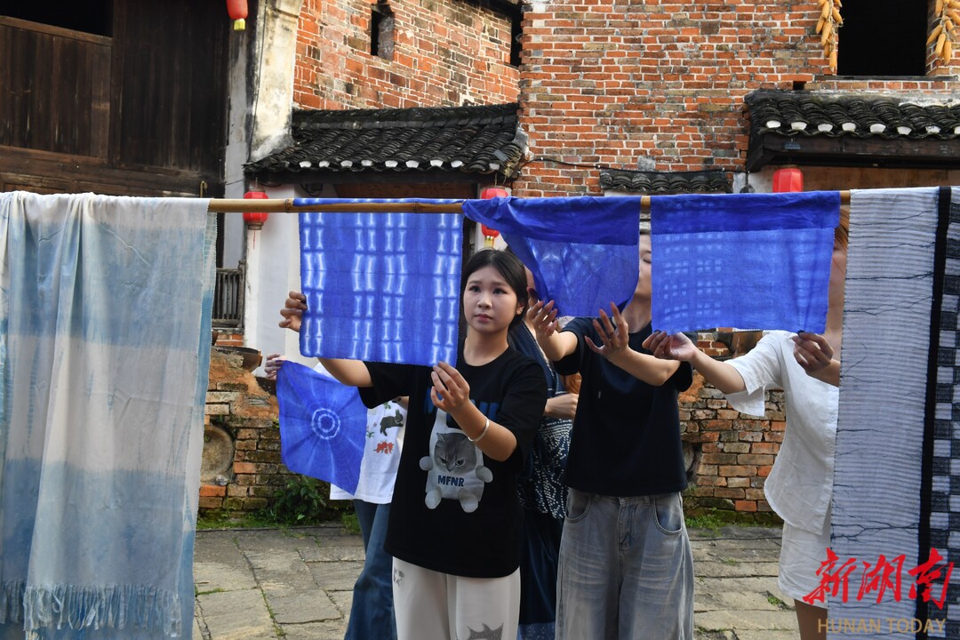 4月19日,江永县勾蓝瑶寨,大学生在晾晒扎染作品。当天,手艺人周佳佳为大学生开展传统扎染教学。在古瑶寨的院落里,学生们体验捆扎、浸染、晾晒全流程,于蓝白交织中感受扎染魅力,让古老技艺在青春传承中焕发新生。黄海 摄(湖南图片库)