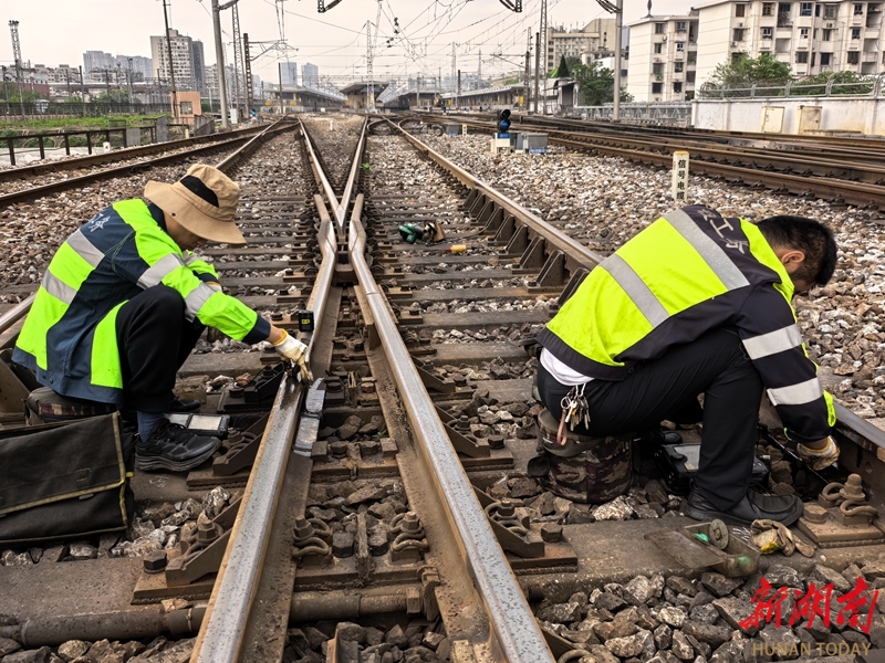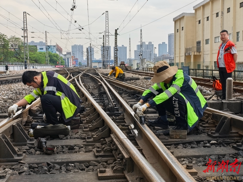 4月20日,中国铁路广州局集团有限公司长沙工务段长沙探伤一工区职工们,在长沙站开展钢轨探伤作业。连日来,该段在京广线、沪昆线实施集中修施工,通过线路清筛、更换道岔与钢轨、捣固等作业,全面提升线路设备质量,为即将到来的“五一”假期旅客运输安全提供有力保障。黄得利 胡志刚 摄影报道(湖南图片库)