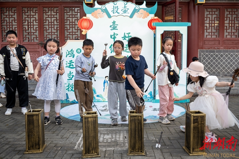 4月19日,小朋友在体验投壶。当天,2026年桂阳县民俗文化展演系列活动正式拉开帷幕。活动涵盖“三月三”晒歌会、戏曲展演、龙狮表演等,让游客从早到晚都能沉浸式感受民俗文化的独特魅力。欧阳常海 摄(湖南图片库)