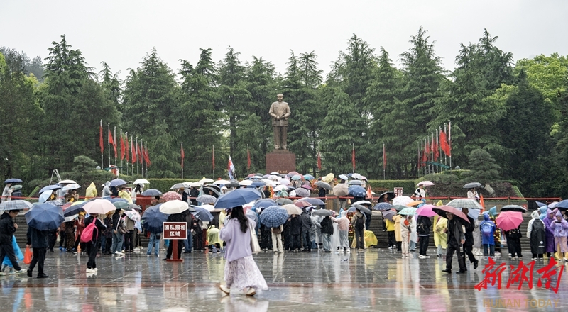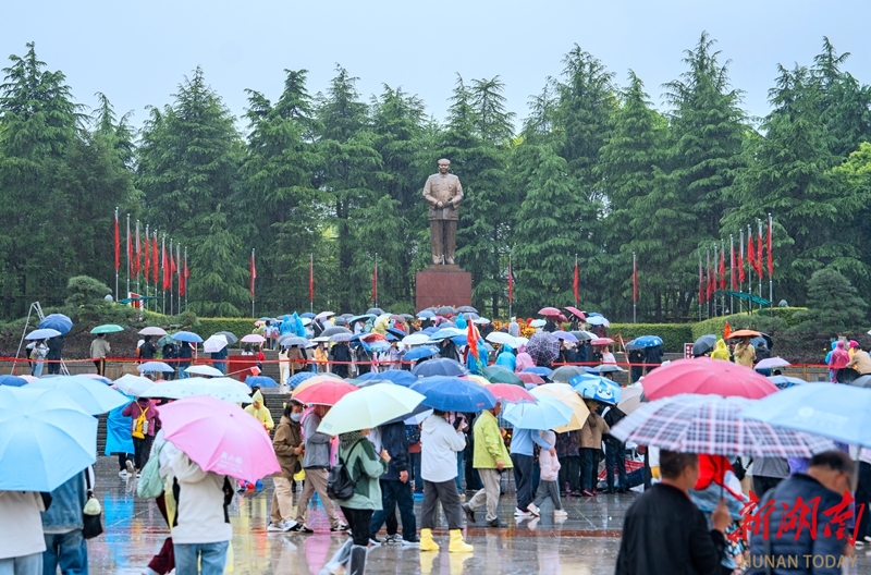 4月20日,游客在韶山市毛泽东广场参观。当天,阴雨连绵,却挡不住各地游客前来瞻仰的脚步,不少游客撑伞驻足,怀着崇敬之情瞻仰毛泽东同志铜像,在雨中深切缅怀伟人。 湖南日报全媒体记者 李健 摄