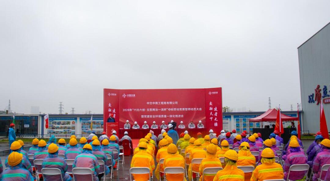 4月14日,中交中南工程局2026年“六比六创·五型两治一流杯”夺标劳动竞赛誓师动员大会暨党建安全环保质量一体化推进会在长浏磁浮快线三标项目隆重举行。此次活动旨在通过劳动竞赛激发全员干事创业热情,并同步推进党建与安全、环保、质量工作的深度融合。