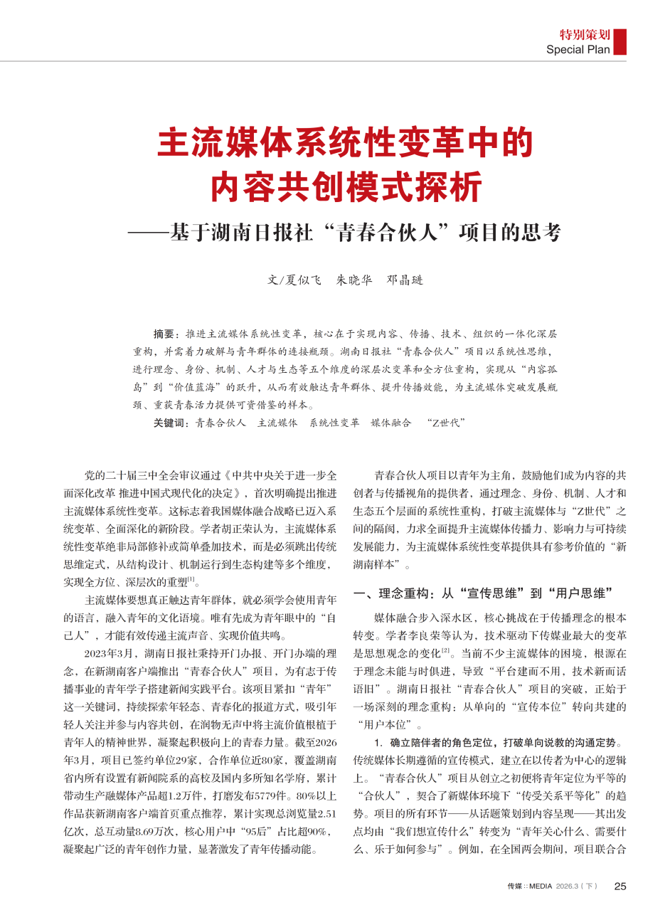 近日,湖南日报社副总编辑夏似飞,湖南日报社新湖南编辑中心副主任朱晓华,湖南日报社时政频道副总监邓晶琎在《传媒》2026年第6期刊发文章《主流媒体系统性变革中的内容共创模式探析——基于湖南日报社“青春合伙人”项目的思考》。