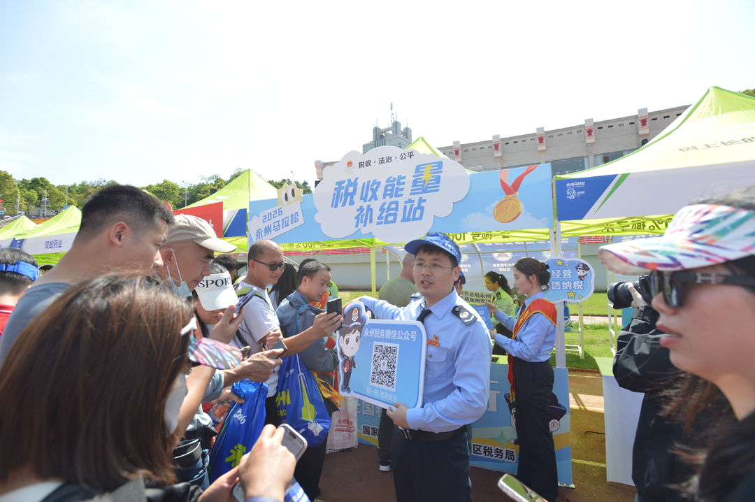 4月18日,永州马拉松博览会现场,参赛物资领取处人声鼎沸。跑友们穿梭于各个展台之间,或举着号码布合影,或互相击掌打气,谈笑声、加油声此起彼伏。而在场地一角,“税收能量补给站”的展台前人头攒动,成为博览会现场人气最高的打卡点之一。