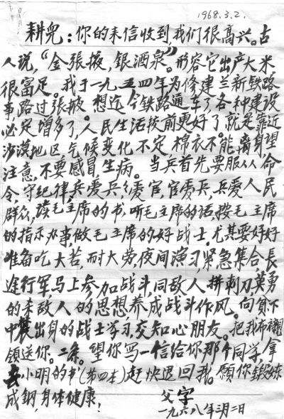 这是1968年滕代远写给刚到部队当兵的长子滕久耕的一封信。1968年久耕离家那天,滕代远一遍遍地检查孩子的行装,还送给他一套《雷锋日记》和《毛泽东选集》四卷合订本,他叮嘱儿子:“到了部队一定要努力学习毛主席著作,不要忘记革命前辈创业的艰难,向工农出身的战士学习,做雷锋式的好战士。”久耕到了部队后,主动要求到炊事班工作,脏活累活争着干,处处吃苦在前。过了段时间,他写信给爸爸,汇报在部队工作学习的情况,滕代远阅后欣然提笔,给久耕写了这封信。从信中可以看出,滕代远对子女的要求很严格,不让孩子以干部子弟自居。
