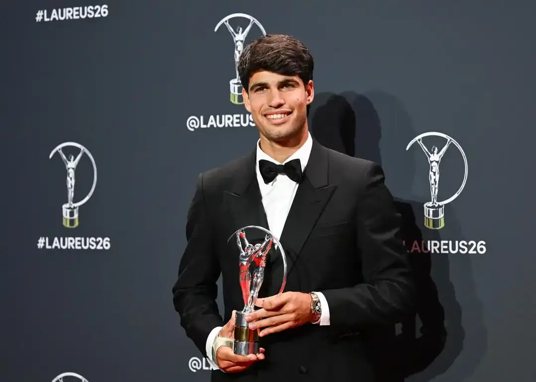 阿尔卡拉斯在2025赛季表现出色,全年夺得8项赛事冠军,其中包括法网和美网两项大满贯,并以年终世界排名第一的成绩结束赛季。凭借这一成绩,他击败同获提名的意大利网球选手辛纳、法国足球运动员登贝莱等体坛名将,成为继费德勒、纳达尔和焦科维奇后第四位获此殊荣的男子职业网球选手协会(ATP)选手。