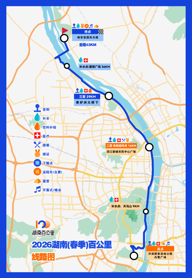 2026春季百公里以“万物竞发,热血出征”为主题,以徒步毅行串联城市风光与国风文化,打造春日硬核徒步狂欢。本届活动起点设于长沙洋湖国家湿地公园白鹭广场,全程约43公里,途经滨江新城市民中心广场、潇湘北大道、长沙综合枢纽大桥,最终抵达长沙铜官窑国风乐园。活动设置43公里毅行组与16公里体验组,满足不同人群参与需求,实现“一日穿行星城,一夜梦回盛唐”。
