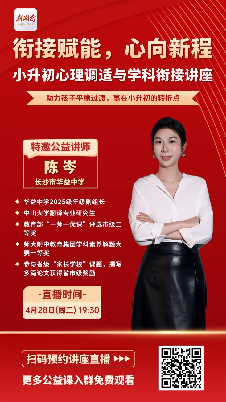 小升初是孩子成长道路上的一个重要转折点。面对全新的环境、增加的学科、变化的节奏,不少学生和家长感到焦虑与迷茫:如何快速适应初中生活?怎样做好心理准备与学科衔接?为帮助广大小升初家庭从容应对这一关键阶段,新湖南直播平台特邀长沙市华益中学2025级年级副组长陈岑老师,将于4月28日(周二)19:30带来《衔接赋能,心向新程——小升初心理调适与学科衔接》专题公益讲座,从心理适应与学习衔接两个维度,助力孩子平稳过渡,赢在小升初的转折点。