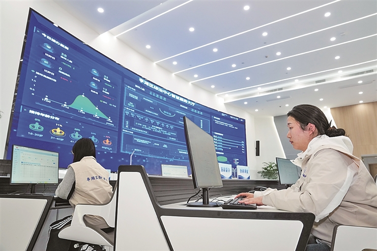 工作人员在江苏盐城市亭湖区综治中心开展指挥调度工作。新华社发