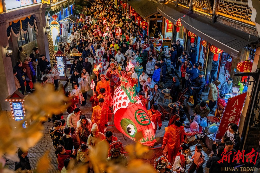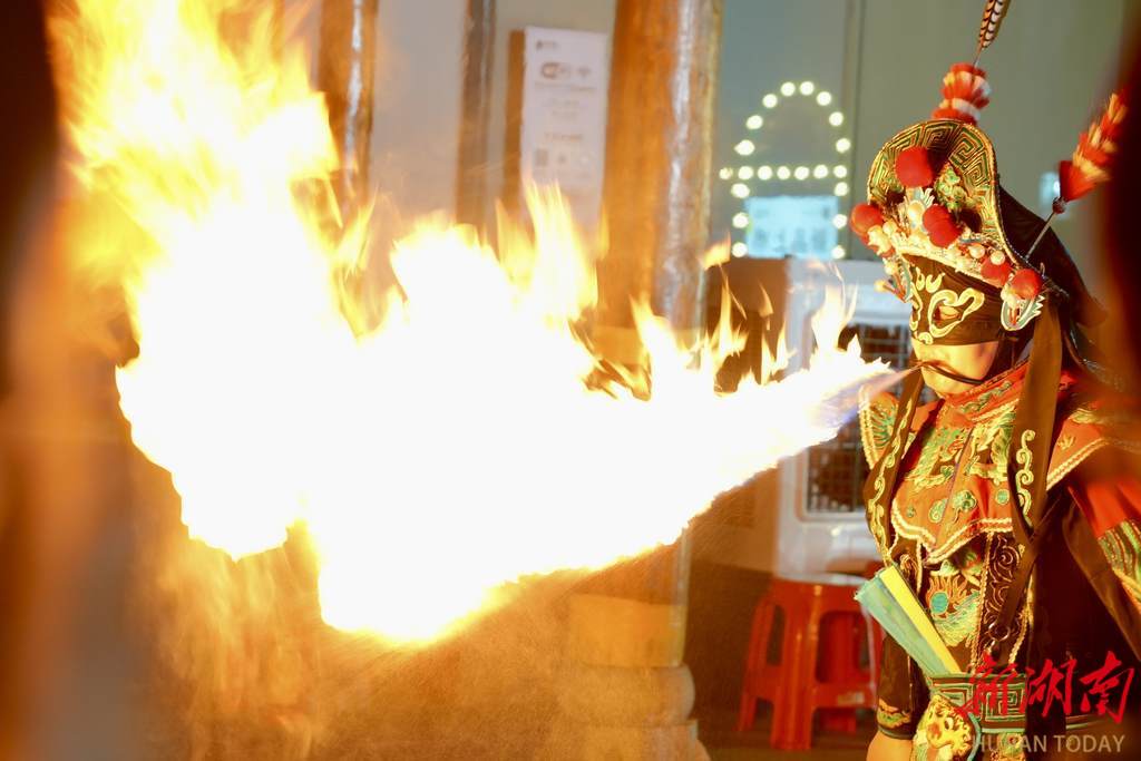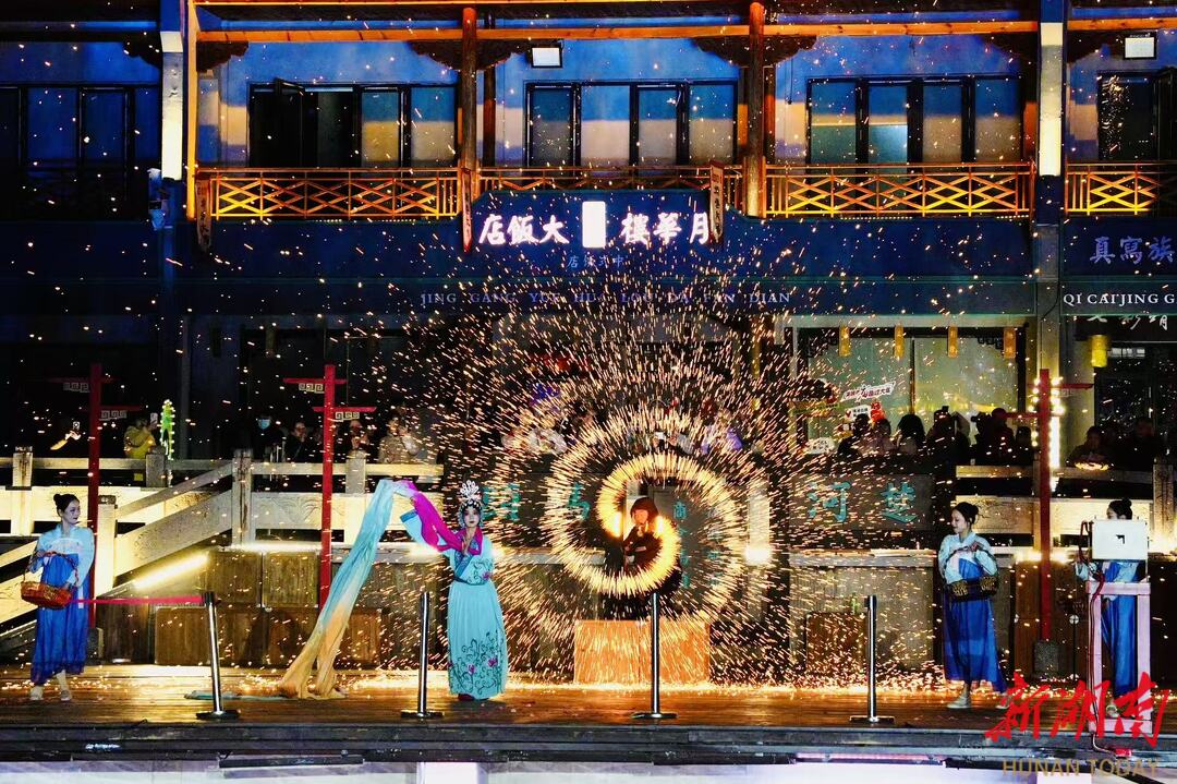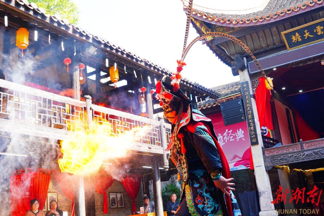 白天的靖港古镇同样热气腾腾。楚河码头每天上演舞台好戏:旗袍秀、赤焰武魂、小品《姥爷招婿》、魔术小丑、民谣嗨歌轮番炸场。古镇街巷内,皮影戏、变脸喷火、花鼓戏、复古Disco派对、中式婚礼、特色餐艺秀等“一步一戏”,让游客沉浸式感受老长沙“戏窝子”的浓厚氛围。