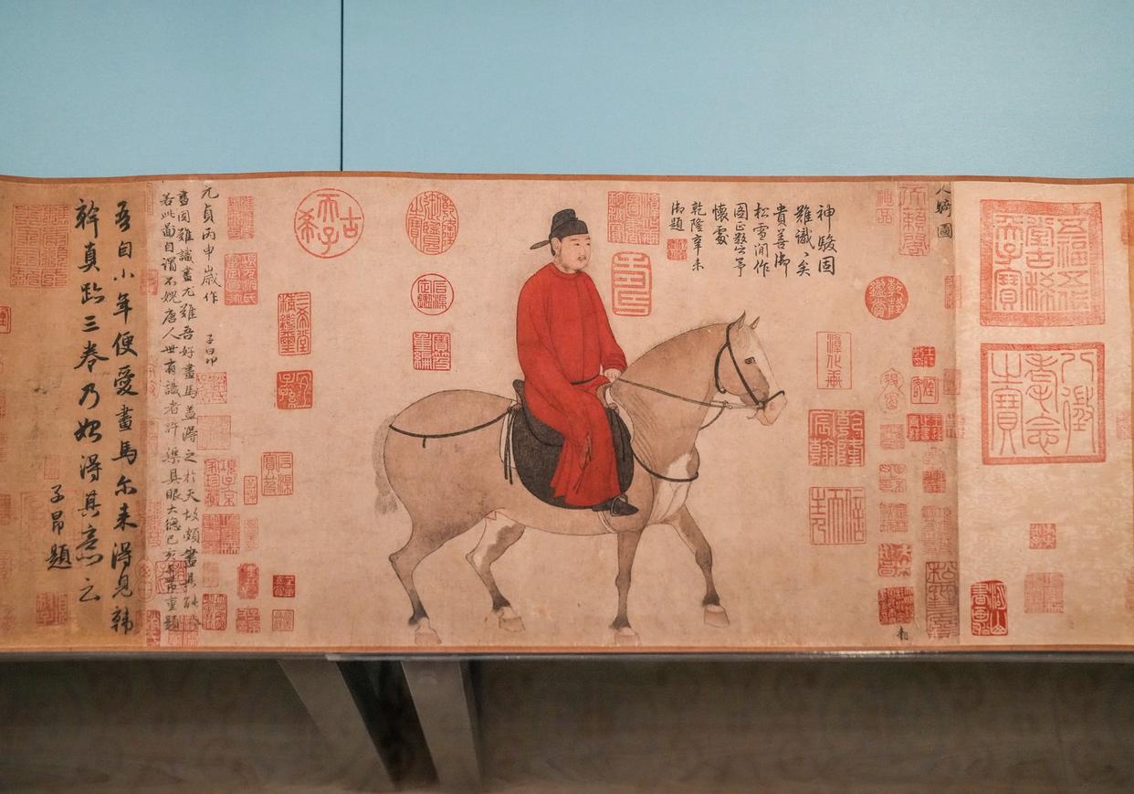 “神骏:故宫书画艺术中的马世界”展出的元代赵孟頫《人骑图》(局部)。