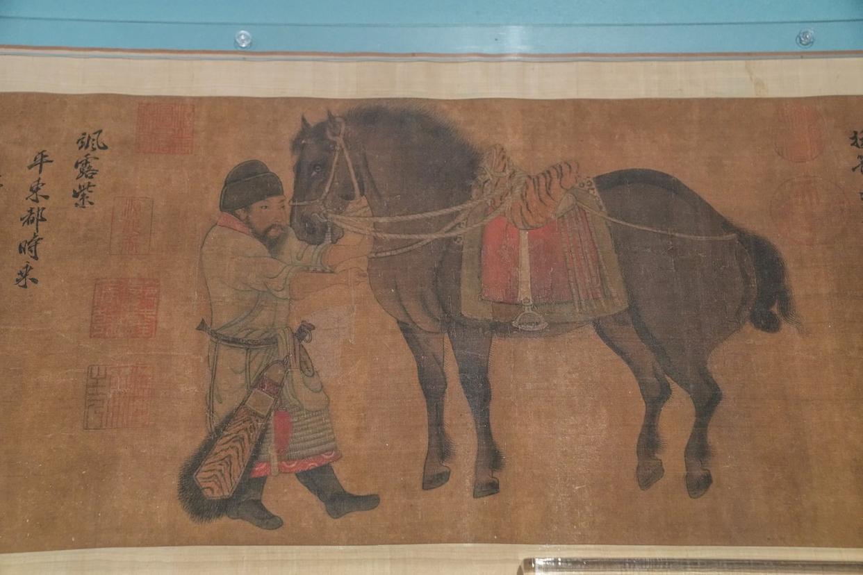 “神骏:故宫书画艺术中的马世界”展厅内,参观者在宋代李公麟《摹韦偃牧放图》卷前驻足。 “这是公认的李公麟真迹之一。我仔细数了数,画面上一共有1247匹马、142个人,可谓洋洋洒洒。”故宫书画部研究馆员马顺平说,宋代画家临摹唐人作品,绝非简单的复制粘贴,而是加入了自己的风格。比如,画马的线条柔中带刚,并非唐代崇尚的充满力量感。“人马虽多,但整个作品主次分明、生动活泼,不呆板,不混乱。如此庞大的构图,一定经过了长时间的经营和缜密的运思。”