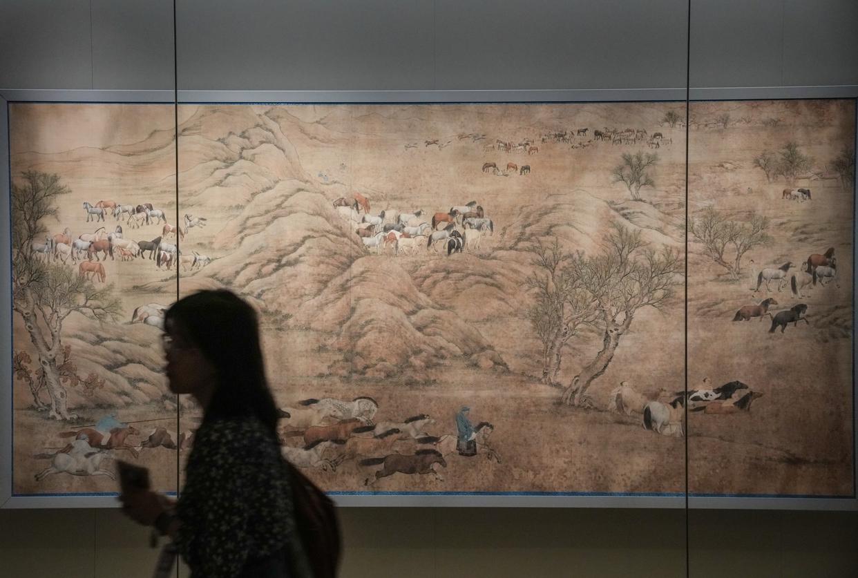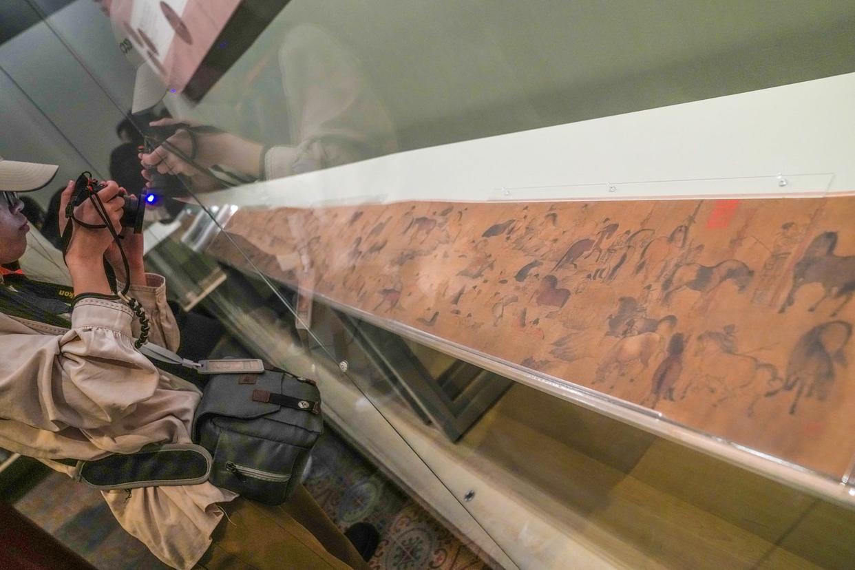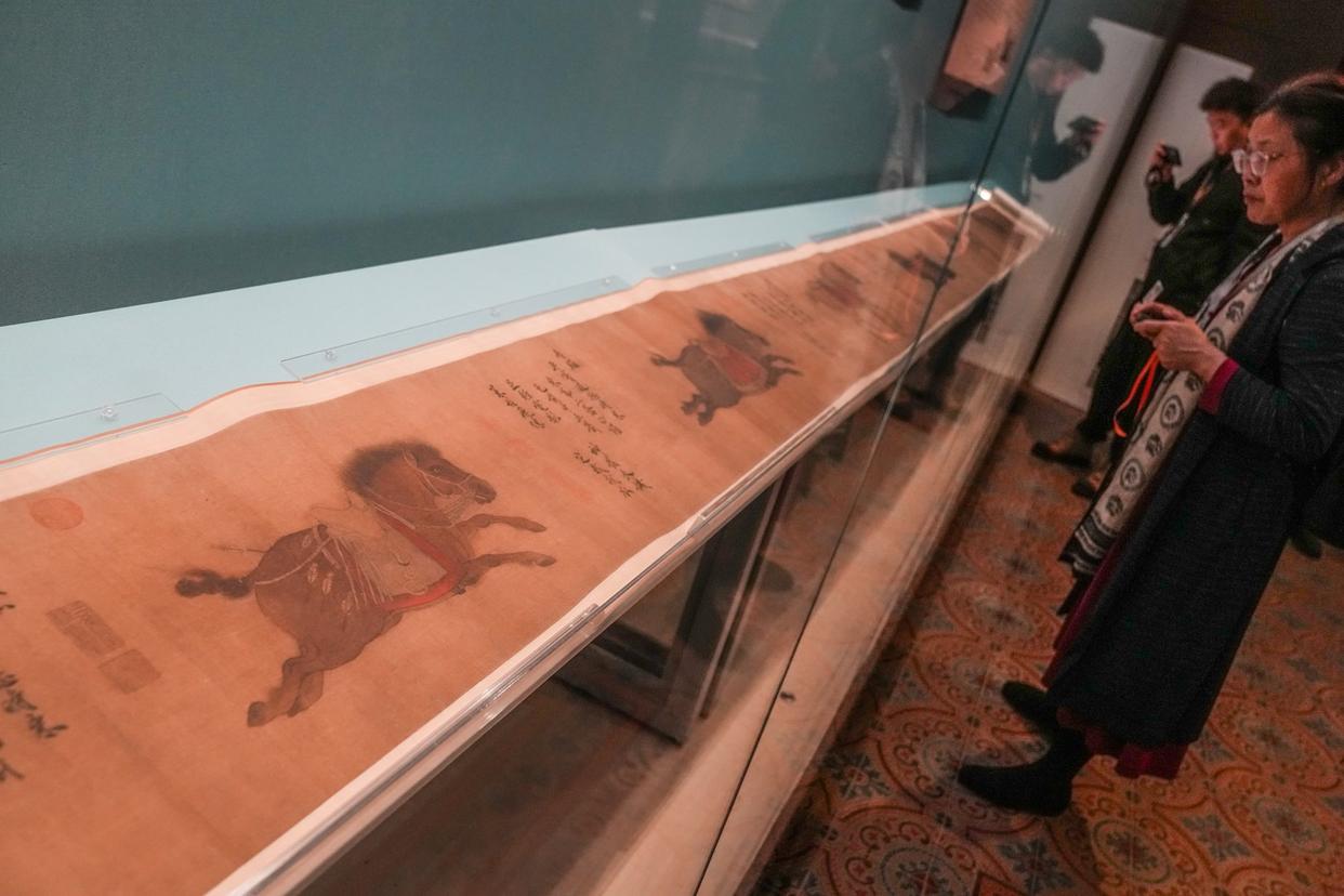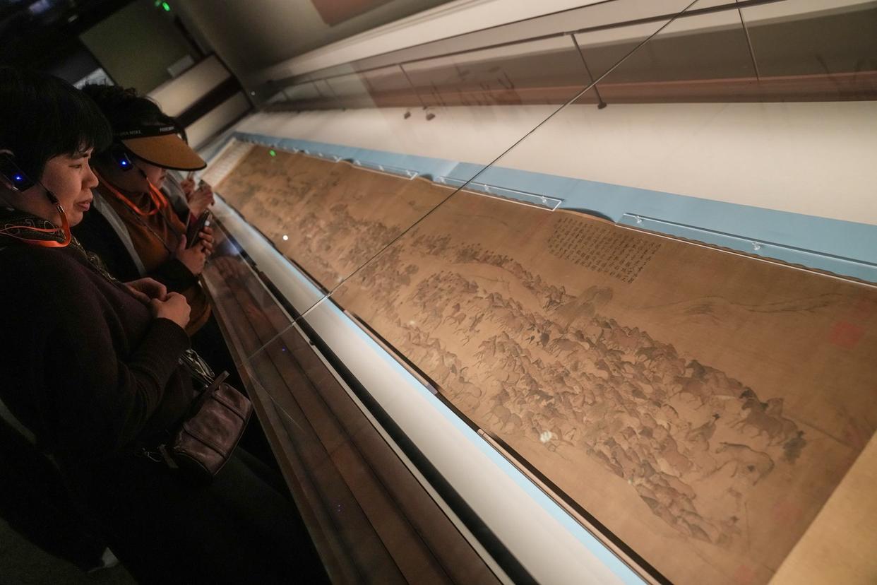 “神骏:故宫书画艺术中的马世界”展览展出的唐人(传)《百马图》卷吸引参观者驻足。