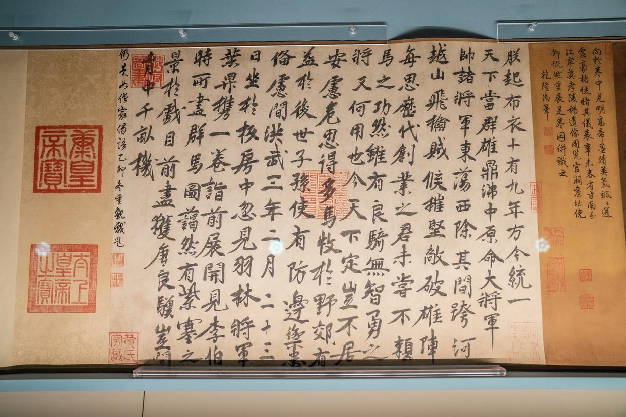 宋代李公麟《摹韦偃牧放图》卷上的朱元璋题跋。与这件中国古人画马巅峰之作“对视”的,是郎世宁《阚虎骝图》,《十骏图》中第二轴,马身棕白相间,鬃毛细而不乱,渲染自然,富有层次,是西方画法的巅峰之作。