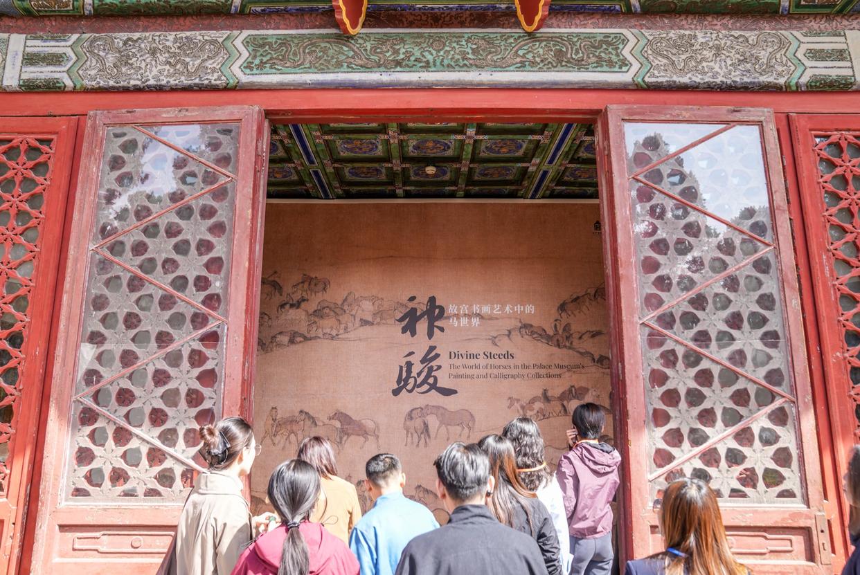 图为“神骏:故宫书画艺术中的马世界”展厅内,参观者驻足观展。包括这幅画在内,故宫重磅特展“神骏:故宫书画艺术中的马世界”展一口气展出了55件“神骏图”,其中20件是国宝级别,金代赵霖《昭陵六骏图》、元代任仁发《出圉图》、清代郎世宁《阚虎骝图》等历代画马名作悉数到场。还有传世唯一记录了“马厩养猴”习俗的《百马图》卷等28件未曾展出过的精彩作品首秀。