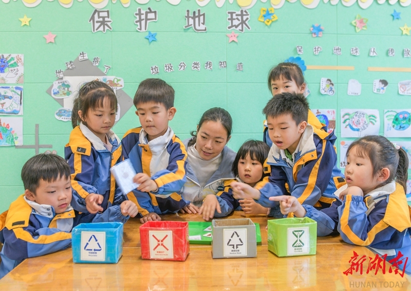 4月21日,道县城南幼儿园,孩子们在老师的指导下学习垃圾分类知识。世界地球日到来之际,该县各学校开展“珍爱地球 从我做起”主题活动,倡导学生保护环境、珍爱地球。蒋克青 罗文 摄影报道(湖南图片库)