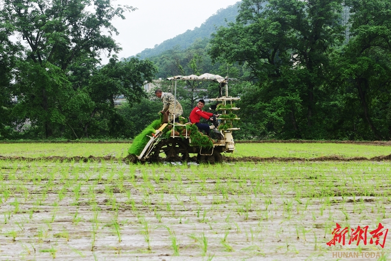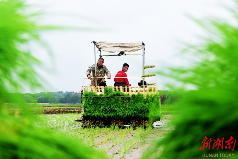 4月21日,蓝山县土市镇土市社区,村民在田间机插早稻秧苗。时下,当地抢抓早稻插秧关键农时,全力推进早稻机械化插秧作业。黄春涛 摄(湖南图片库)