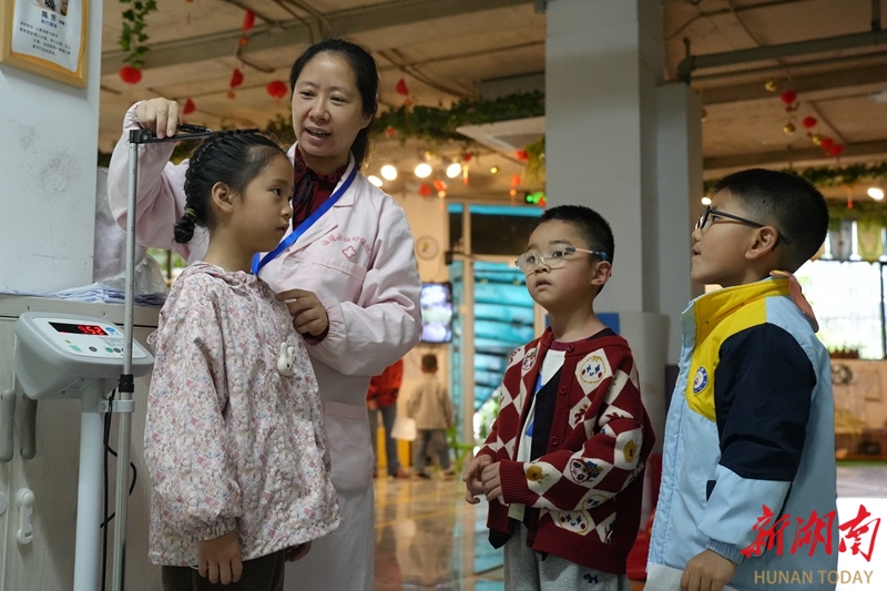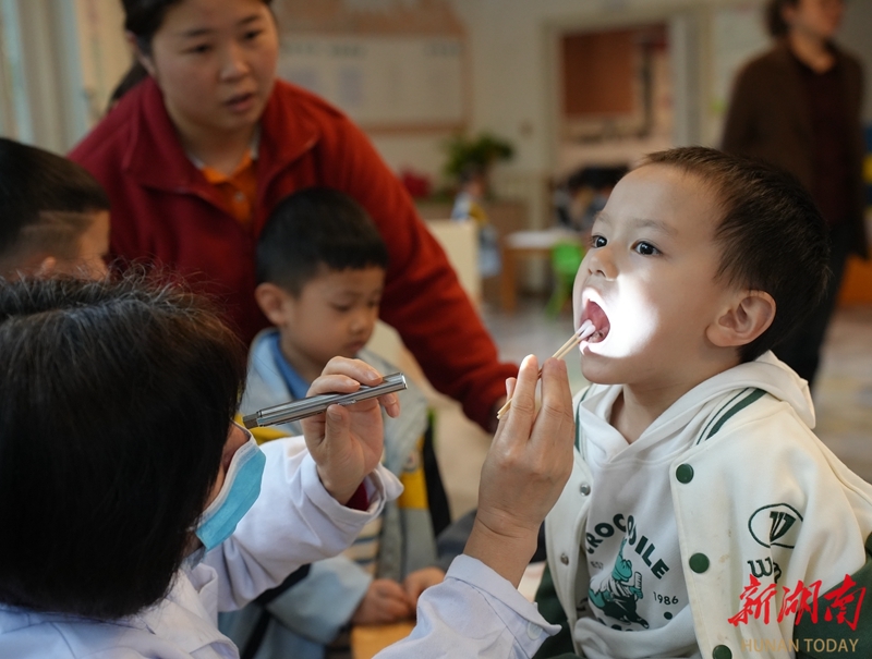 4月21日,通道侗族自治县双江镇亚迪幼儿园,县妇幼保健医院医护人员在为孩子们进行体检。近年来,该县持续推进儿童健康守护工程,将学龄前儿童免费健康体检纳入民生实事,通过建立健康档案,开展疾病筛查等,全力守护儿童健康成长。李尚引 谢文娟 摄影报道(湖南图片库)