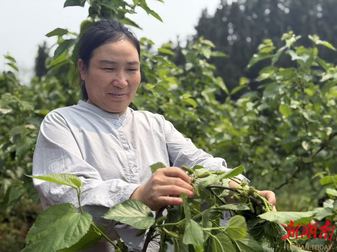 (丽云山庄负责人王丽云在桑葚基地忙碌)