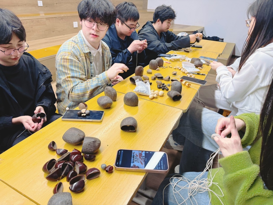 活动现场,工作人员准备了各类天然果壳、彩绳、木珠、铃铛、颜料与装饰配件,为同学们打造贴近自然、轻松治愈的创作空间。大家纷纷拿起材料,精心挑选果壳、搭配色彩、穿绳系铃,一笔一画描绘春日纹样,一环一节串联美好期许,将对生活的热爱、对未来的祝福融入每一处细节。在轻柔的春风与舒缓的音乐中,同学们专注创作、轻声交流,现场氛围温馨雅致、暖意融融。
