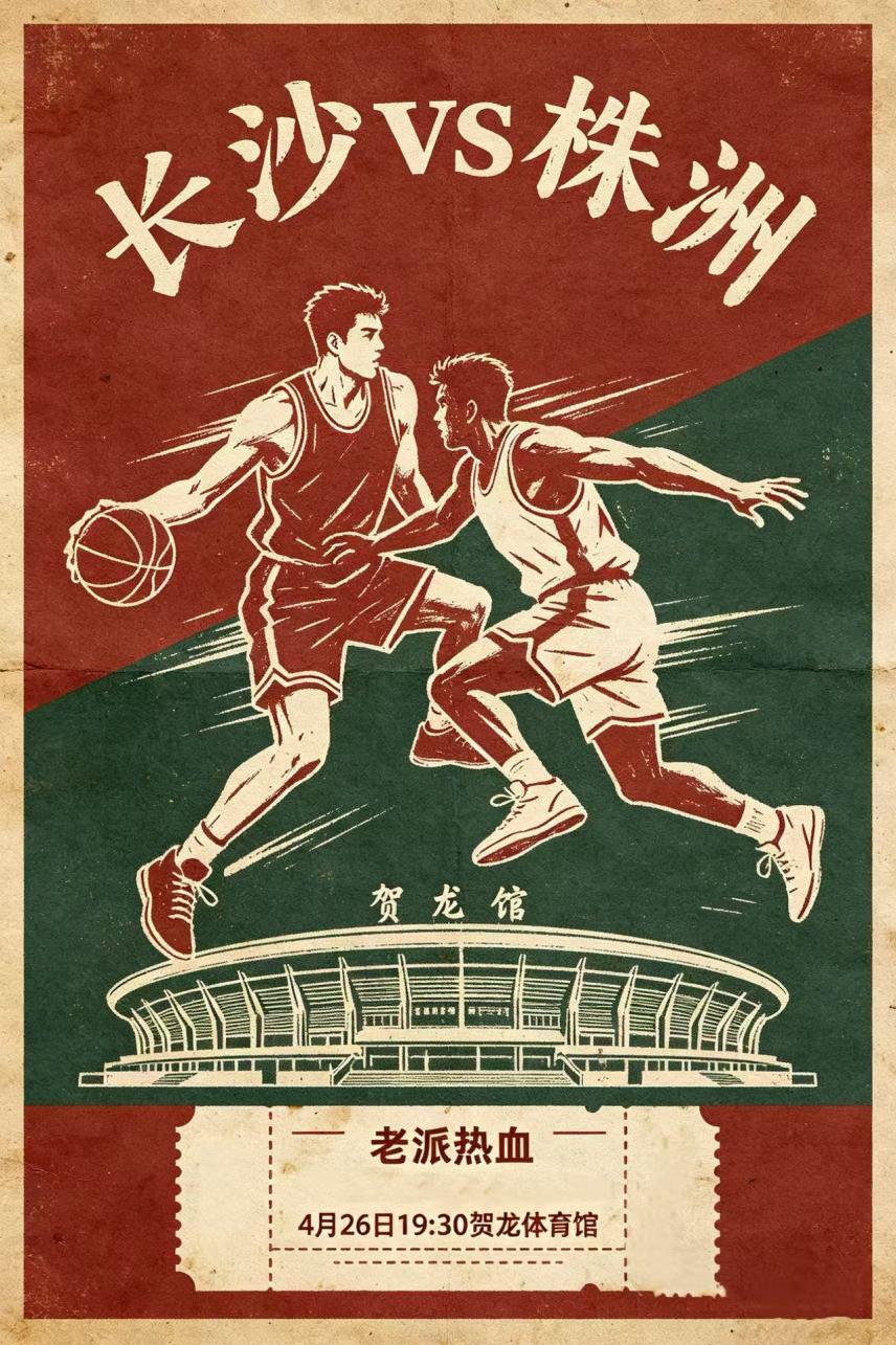 暖调日落鎏金的油画笔触铺满画面,厚重肌理感氛围感十足;顶部醒目粗红大字点出湘BA联赛·长沙vs株洲的热血对决,画面中心贺龙体育馆巍峨矗立,身后是长沙城绵延舒展的城市天际线,前景篮球场上三名球员逆光的热血剪影,搭配篮筐与滚烫球场,将篮球竞技的张力拉满;底部清晰标注开赛时间与场馆地点,地域热血、运动激情与城市黄昏的浪漫底色完美交融,既尽显湖南本土篮球赛事的澎湃张力,又兼具复古艺术质感,一眼就点燃奔赴赛场、为城市而战的沸腾期待。(图文/张依婷)