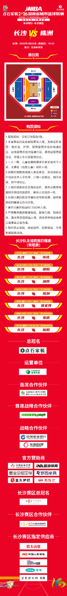 本轮赛事开票时间为4月23日18:00。抢票方式:登录“运动猿平台”微信小程序或“看个比赛”App,搜索“长沙”即可购票。