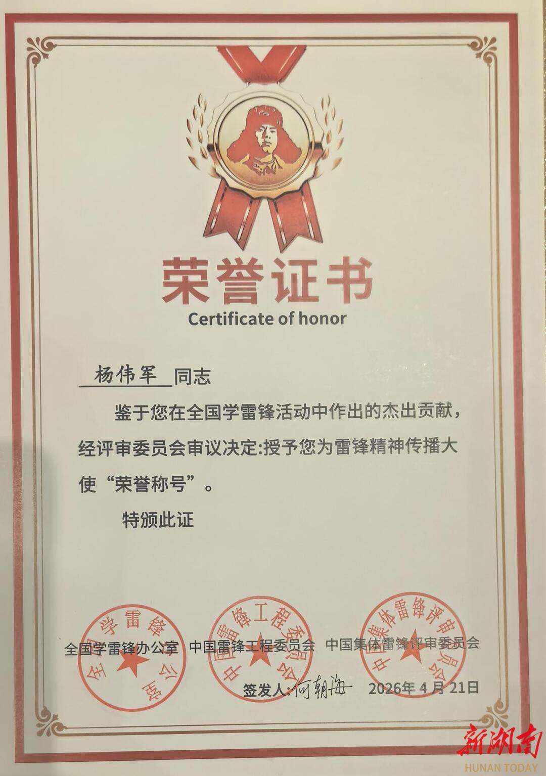 新湖南客户端4月22日讯(通讯员 朱辉)日前,在全国学雷锋先进典型表彰活动中,湖南麓沩轩书画院理事长杨伟军凭借数十年深耕公益、躬身践行雷锋精神、广泛传播新时代雷锋内涵的突出贡献,被全国学雷锋办公室、中国雷锋工程委员会、中国集体雷锋评审委员会授予2026“雷锋精神传播大使”荣誉称号。杨伟军坚持以艺术服务社会、以文化温暖人心,用翰墨丹青书写新时代的雷锋故事,以艺术之力传递社会正能量,在文化艺术领域树立了学雷锋、做雷锋的标杆典范。
