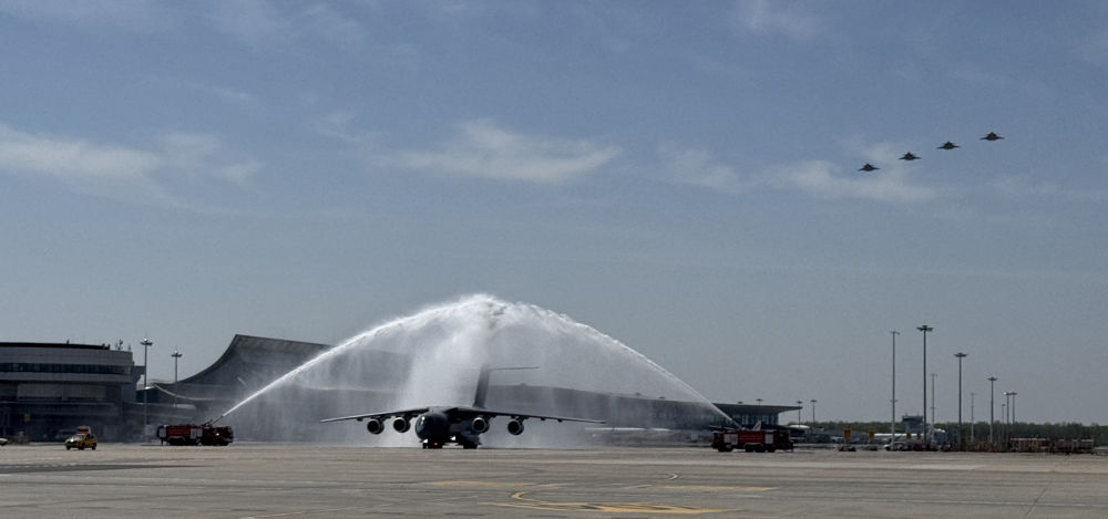 ↑这是接迎第十三批在韩中国人民志愿军烈士遗骸回国的空军运-20B飞抵沈阳,4架歼-20战机护航。