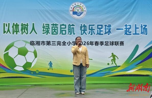 新湖南客户端4月22日讯(通讯员 沈妙蓉)春风拂面,绿茵逐梦。4月21日上午,临湘市第三完全小学2026年春季足球联赛在学校操场开幕。本次活动以“以体树人,绿茵启航,快乐足球,一起上场”为主题,三至六年级全体师生、家长代表及学校行政人员共同参与。