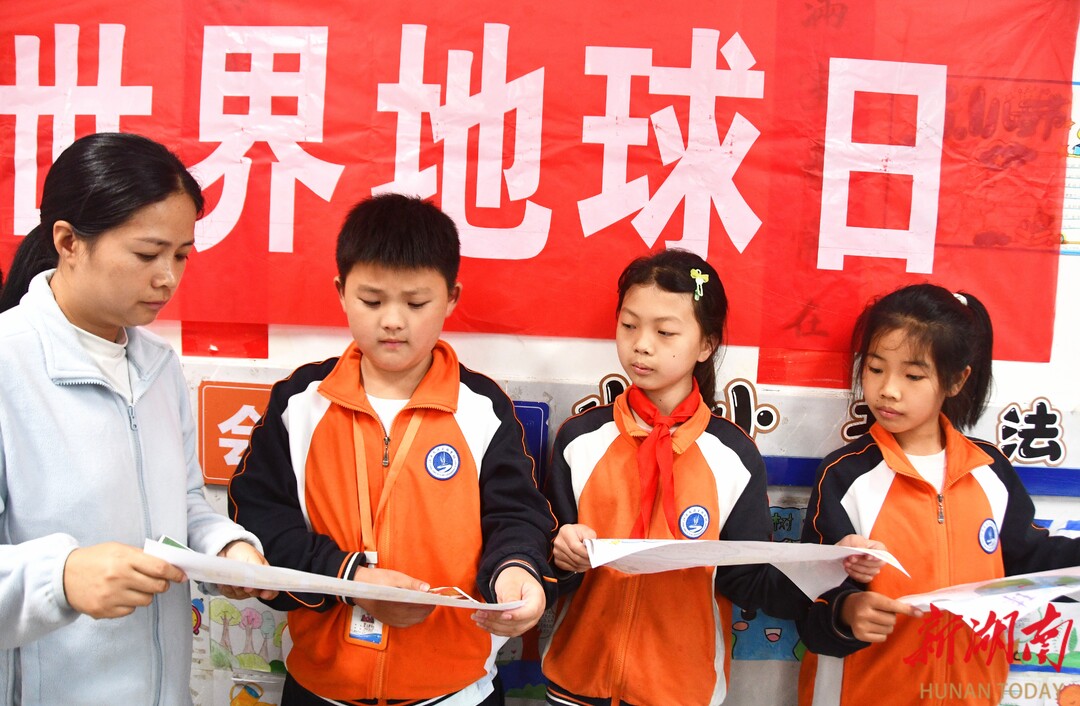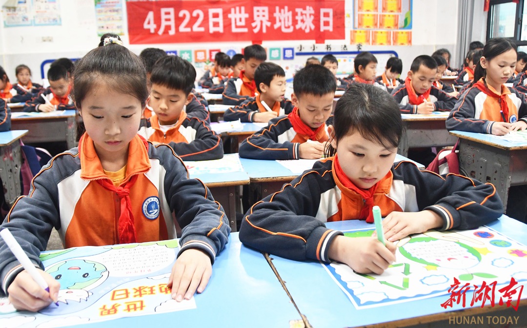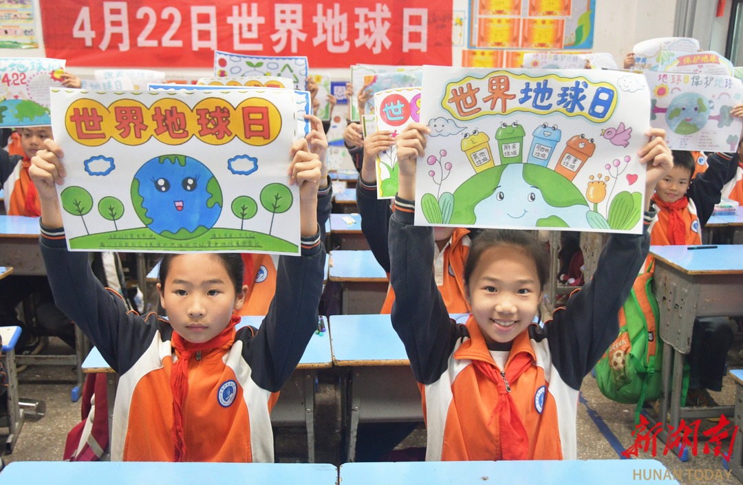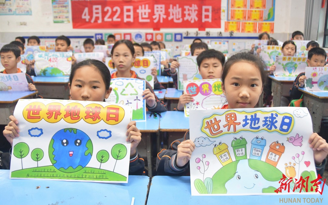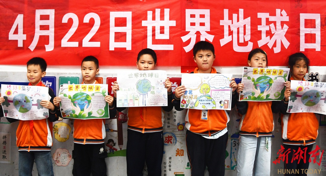4月22日,江永县思源实验学校学生在展示“世界地球日”主题手抄报。当天是世界地球日,该校开展“珍爱地球 守护家园”主题活动,进一步增强学生珍爱地球、保护环境的意识。 田如瑞/摄