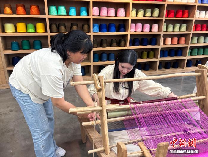 A member of the South Korean delegation tries her hand at Tujia brocade weaving. (Photo/Zhu Jianwen)