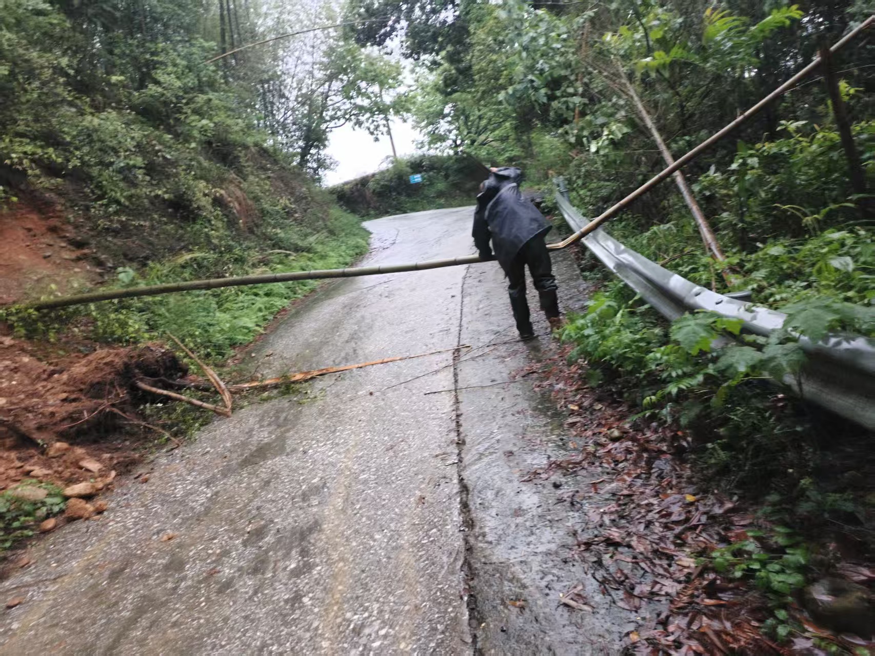 4月21日,道县清塘镇棉竹源村党支部书记黄颜丽冒雨在辖区内巡查时,发现一处路段因雨水冲刷发生轻微滑坡,一根长约5米的竹子横倒路面,道路被阻断。黄颜丽立即组织村干部进行清理,经过紧张作业,横倒的竹子被分段搬离,路面淤泥被清除,交通恢复正常通行。