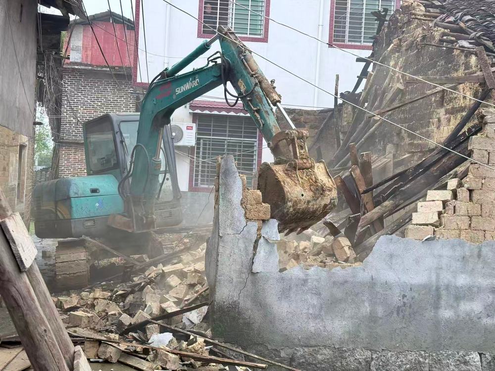 在现场,镇应急办工作人员对房屋的受损程度、结构稳定性进行了鉴定,明确危房隐患等级,划定危险警戒区域。工作人员竖立警示牌,劝导群众远离危险区域,并安排专人全程值守观察;随后调来挖掘机,有序开展危房拆除工作,并及时清理拆除后的建筑垃圾,避免堵塞道路,引发二次安全隐患,保障群众出行畅通。