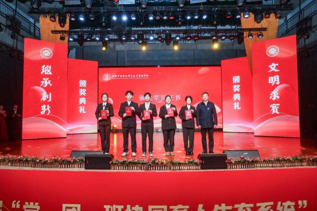 为深化党建引领,落实立德树人根本任务,强化党团班三级协同育人机制,表彰先进典型,4月17日,湖南中医药大学人文与管理学院举行第六届“党团班协同育人生态系统建设”颁奖典礼。校党委副书记汤文胜出席活动,学生工作部与校团委负责人、学院领导班子、各学生党支部书记、辅导员及班主任参加典礼。全体获奖人员、各班学生干部及学生代表共同参会。
