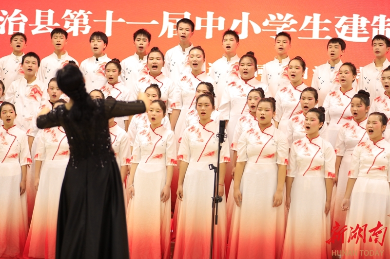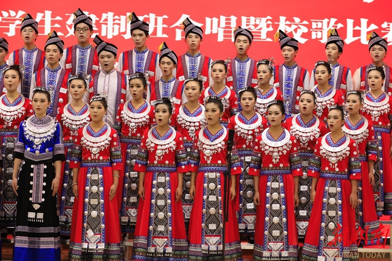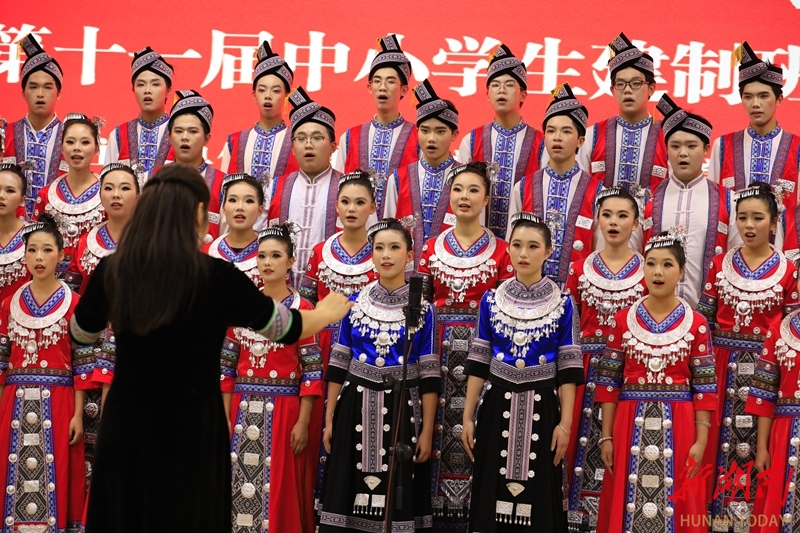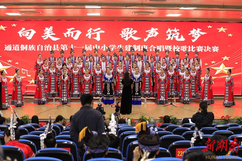 4月22日,通道侗族自治县第二完全小学,学生在参加合唱比赛。当天,该县举办第十一届中小学生建制班合唱比赛暨校歌比赛决赛,20支优胜队伍以歌为媒、以声传情,用清澈的和声展现侗乡学子朝气蓬勃的精神风貌,为观众献上一场视听盛宴。吴旭 粟道斌 摄影报道(湖南图片库)
