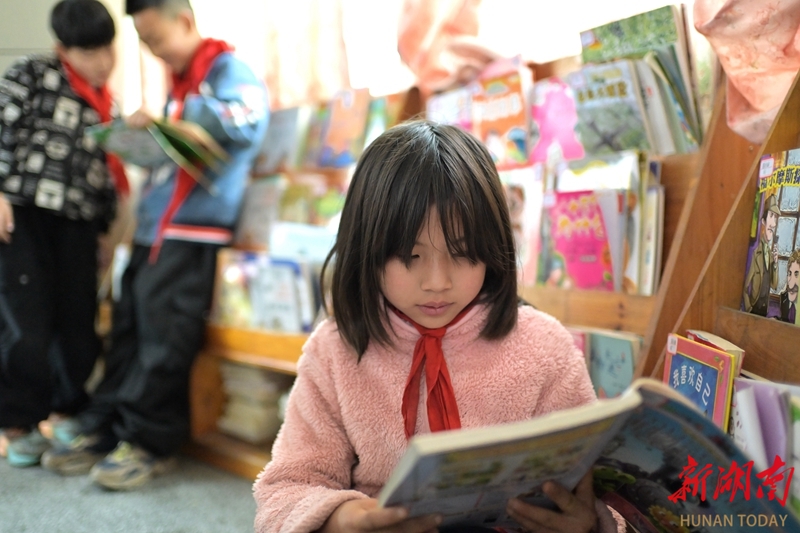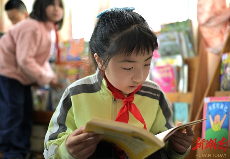 4月22日,花垣县花垣镇团结中心小学,学生在读书角认真阅读。世界读书日即将到来之际,各地举行形式多样的阅读活动,让人们徜徉书海、浸润书香。龙恩泽 摄(湖南图片库)