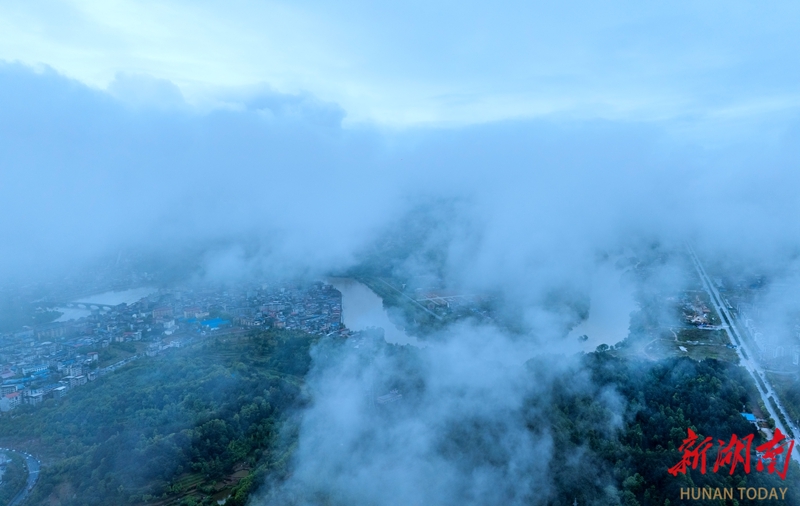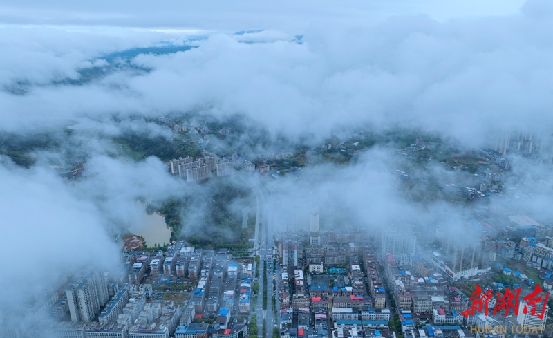 4月22日清晨,新宁县城上空出现唯美云雾景观。轻纱般的白雾在城区缓缓流动,缠绕楼宇、漫过街巷,将整座山城笼罩在朦胧诗意之中。 湖南日报全媒体记者 李健 摄
