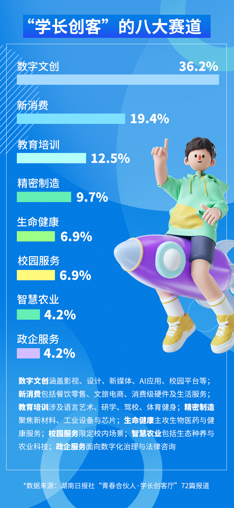 其中,数字文创占比最高(36.2%),新消费紧随其后(19.4%),教育培训与精密制造分列第三、第四,展现了湖南大学生创业的多元生态。
