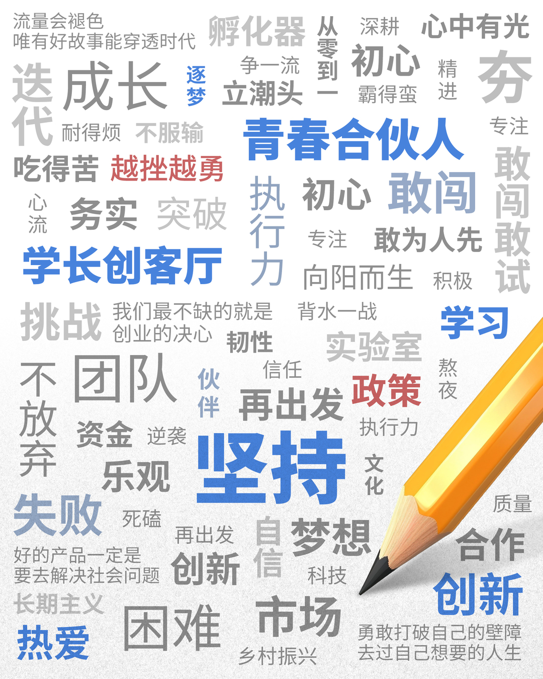 最后,我们从创业故事中提炼出关键词,也听见“学长创客”的心声。一字一句,都是真实的挣扎与成长。