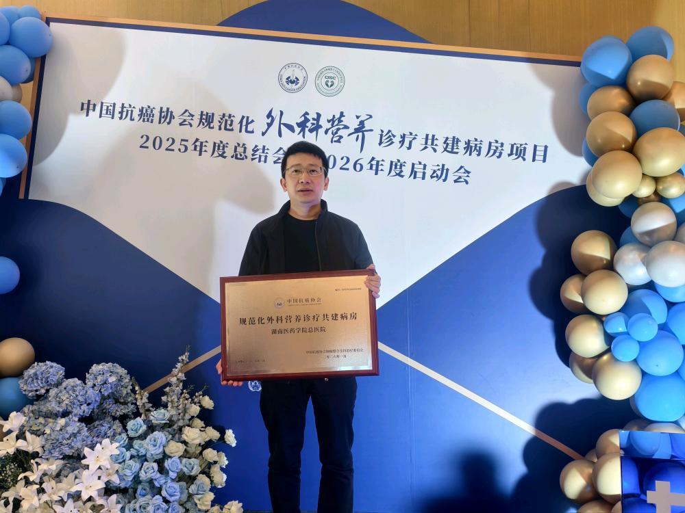 近日,中国抗癌协会肿瘤整合支持治疗委员会授予湖南医药学院总医院“规范化外科营养诊疗共建病房”称号。这标志着该院在外科营养诊疗领域的规范管理、技术能力与多学科协作水平获得权威认可,也为五省边际区域医疗中心建设注入新的支撑力量。