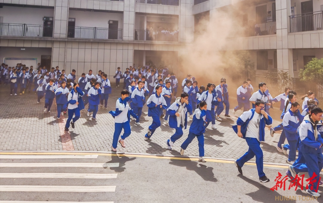 烟雾模拟险情,学生们弯腰捂鼻、沿预定路线有序撤离