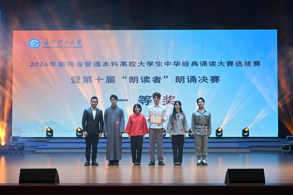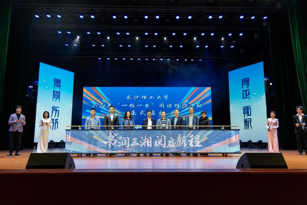 4月20日晚,长沙理工大学云塘校区大会堂灯火璀璨、座无虚席,2026年“一校一书——经典、精读、经世”阅读推广活动启动仪式在这里举行。湖南省政协委员、湖南省图书馆学会理事长邹序明,湖南省高校图工委秘书长、湘潭大学图书馆馆长龚蛟腾,中华诗词学会朗诵艺术委员会专职委员吕铭,以及长沙理工大学学生工作部、研究生院、教务处、团委等相关领导出席活动。湖南省普通高校大学生中华经典诵读选拔赛暨学校第十届“朗读者”朗诵决赛也同时精彩上演,以书香铸魂、以文化育人,为校园注入蓬勃向上的青春力量。